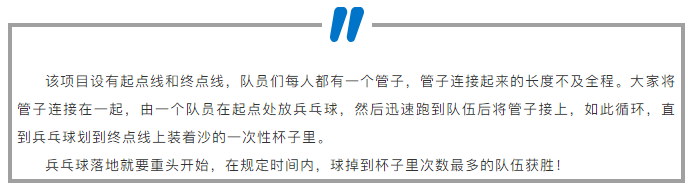 運(yùn)兵乓球是件技術(shù)活,圓球在管子里滑動(dòng)的速度極快,失敗的幾率也高,很考驗(yàn)隊(duì)友間的配合與耐心。若失敗多了,只要一個(gè)隊(duì)友毛躁了,就會(huì)影響項(xiàng)目的完成。