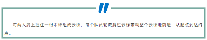 爬過云梯的隊(duì)員也不代表結(jié)束,他們還要搭建云梯,讓剛才搭建云梯的隊(duì)員爬行,這是個(gè)團(tuán)隊(duì)之間的循環(huán)配合!